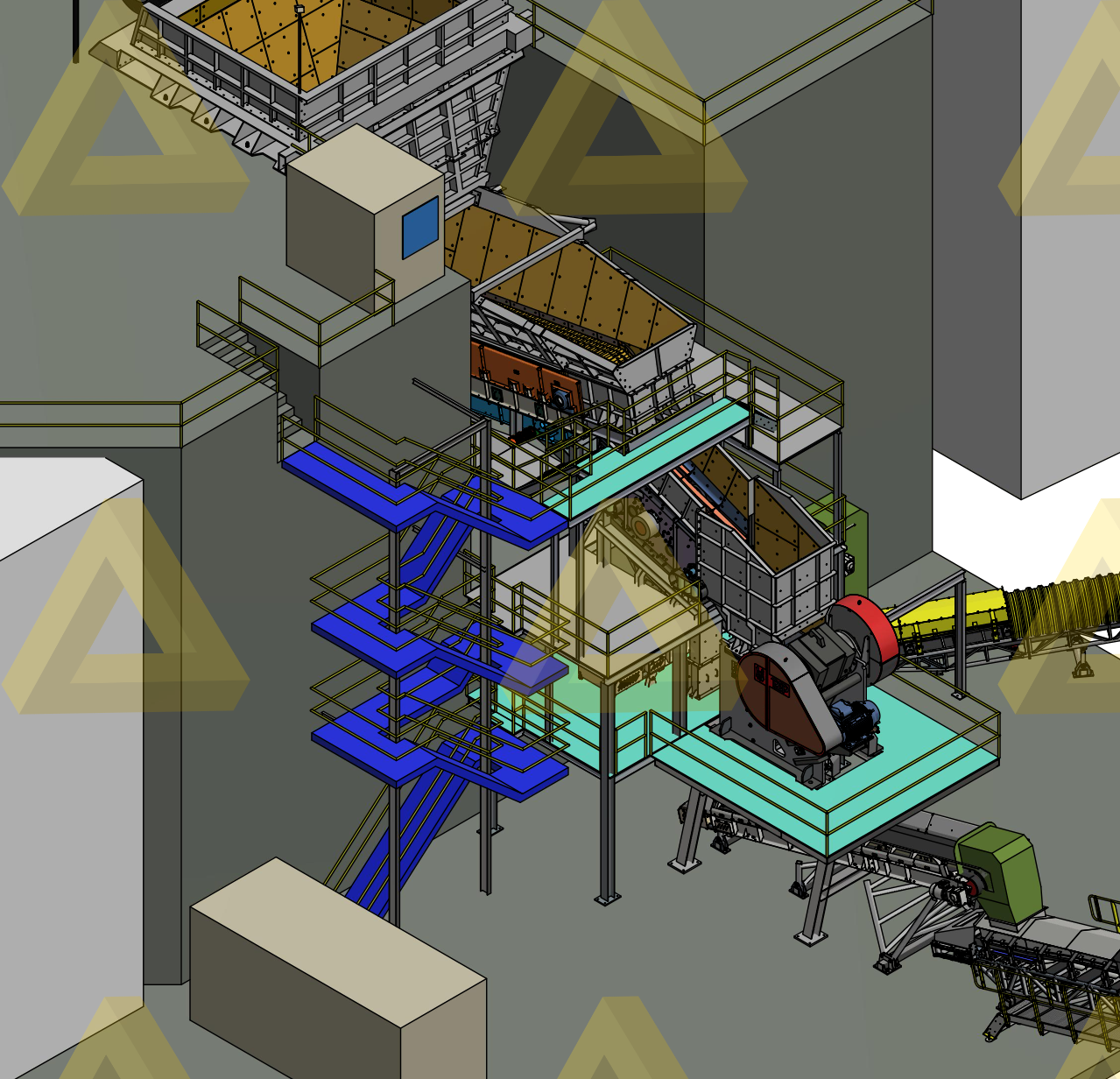 Комплекс представляет собой совокупность сортировочного дробильного оборудования, конвейерного транспорта, а также системы электроснабжения автоматического и управления, объединенных в единую технологическую цепочку: от приемного бункер-питателя до формирования склада готовой продукции.
